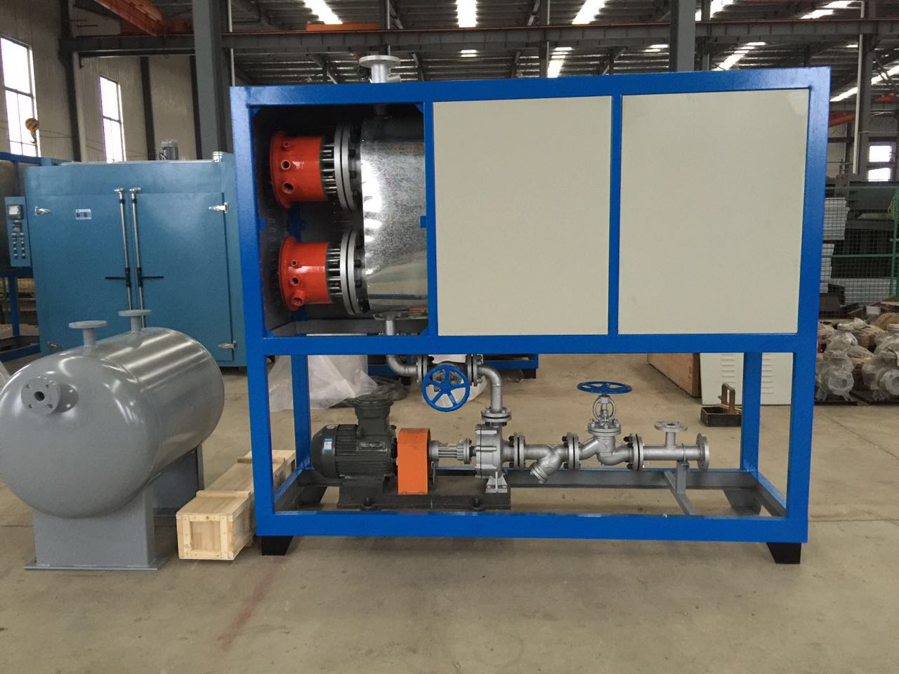 導(dǎo)熱油爐排氣流程: 1、導(dǎo)熱油通過膨脹槽注油口處加注,并通過膨脹口管道流入設(shè)備及油爐本體內(nèi),此時(shí)注油時(shí)一定要打開系統(tǒng)中所有的閥門(放油閥除外),讓導(dǎo)熱油流入筒體及需加熱設(shè)備內(nèi)。 2、當(dāng)液面顯示約為膨脹槽高度1/2時(shí),停止注油。 3、首 行常溫排氣:接通電源,打開導(dǎo)熱油加熱器的進(jìn)出口閥門及排氣閥(膨脹管道閥門需一直開著以及時(shí)補(bǔ)充油量),按動(dòng)油泵啟動(dòng)按鈕,油泵運(yùn)行,油泵應(yīng)按箭頭指示方向正常運(yùn)行,壓力表壓力顯示在規(guī)定范圍內(nèi),視聽油泵運(yùn)行情況,如有異常現(xiàn)象應(yīng)立即停機(jī)檢查,將故障排除后再重新起動(dòng)油泵,進(jìn)行常溫下排氣,直至壓力表指示穩(wěn)定。進(jìn)行常溫排氣時(shí),要注意觀察膨脹槽內(nèi)的液位,當(dāng)?shù)陀谝?guī)定的液位高度時(shí)要及時(shí)進(jìn)行補(bǔ)充。 4、升溫脫水:在確認(rèn)常溫下運(yùn)行正常后,即可進(jìn)行升溫脫水排氣(操作前詳閱導(dǎo)熱油使用說明書及溫控儀使用說明書),升溫脫水排氣可按如下步驟進(jìn)行: 步:升溫至100-120℃保溫 開始升溫時(shí),應(yīng)該控制升溫速度在50℃/h以內(nèi),并且監(jiān)視壓力表顯示是否正常,如發(fā)現(xiàn)無壓力或壓力不穩(wěn),說明系統(tǒng)內(nèi)仍有殘留氣體,此時(shí)要求按3要求重復(fù)進(jìn)行常溫排氣操作,待系統(tǒng)壓力穩(wěn)定后方可繼續(xù),升溫至120℃后進(jìn)行長時(shí)間保溫,保溫時(shí)間的長短與系統(tǒng)總?cè)萘考皩?dǎo)熱油的質(zhì)量有關(guān)。  第二步:升溫至150-180℃保溫。  排除油中輕組分、揮發(fā)物及殘余水分,請參照KRD系列導(dǎo)熱油加熱器系統(tǒng)脫水排氣曲線圖操作 第三步:脫水排氣完成后要關(guān)閉排氣閥(其它閥門無需關(guān)閉),投入正常升溫運(yùn)行。 5、 升溫脫水排氣過程有關(guān)事項(xiàng)。 升溫過程中管路可能會發(fā)出碰擊的響聲,說明系統(tǒng)內(nèi)有大量氣體或管道不暢,此時(shí)要降低升溫速度,待氣體排除便可消除聲響;如系管道不暢所至應(yīng)予以排除。 脫水排氣過程可能會有大量氣體涌入膨脹槽,造成槽內(nèi)導(dǎo)熱油外溢,操作前要在溢油管下安置好溢油容器。 進(jìn)行脫水排氣時(shí),現(xiàn)場必須有人員看守,發(fā)現(xiàn)異常及時(shí)處理。   對于所提的油泵無油或少許油流出的問題,解決方案如下: 1、 關(guān)閉出油口閥門,啟動(dòng)油泵,觀察壓力表顯示情況,若無壓力,則說明回油口無油補(bǔ)充油泵,使得油泵空轉(zhuǎn),無后續(xù)油及時(shí)補(bǔ)充,則請貴司檢查一下回油口的供油情況,此時(shí)請確保膨脹槽里有油并膨脹管道閥門打開和需熱設(shè)備有油并出油口閥門在打開狀態(tài)。 2、 如果以上要求都執(zhí)行到位,壓力表還無壓力,請檢查油爐上的油泵、截止閥及過濾器是否堵塞。 3、 若壓力表顯示壓力值,而油泵、截止閥及過濾器并無堵塞,那油爐的出油口一定會按油泵所提供的流量進(jìn)行流出。